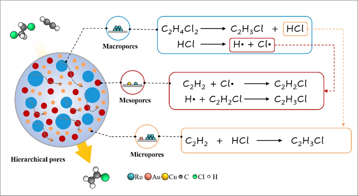 二氯乙烷(EDC)-乙炔串联(EAC)反应是制备PVC单体氯乙烯(VCM)的潜在路线,但该反应仍停留于基础研究阶段,这可归因于EAC包含吸热的EDC脱HCl与放热的乙炔氢氯化两步,热需求相反且产物VCM与C2H2存在竞争吸附,传统双反应器或分层催化剂床存在中间体传递低效、时空匹配难等问题。我们研究团队基于C2H2与VCM的吸附能梯度设计活性位点成功开发了一条崭新的等级孔内置串联接力催化体系,借助毛细管驱动、离子液体辅助的选择性孔道填充策略,将单一碳材料大、中、微孔中精准限域Ru、Ru-Cu、Au-Ru活性位点。随着反应气流大-中-微孔扩散顺序,驱动了“大孔EDC脱HCl—介孔自由基加成—微孔乙炔氢氯化”定向级联反应路径,实现了乙炔转化率接近热力学极限,并且反应稳定运行1200 h。